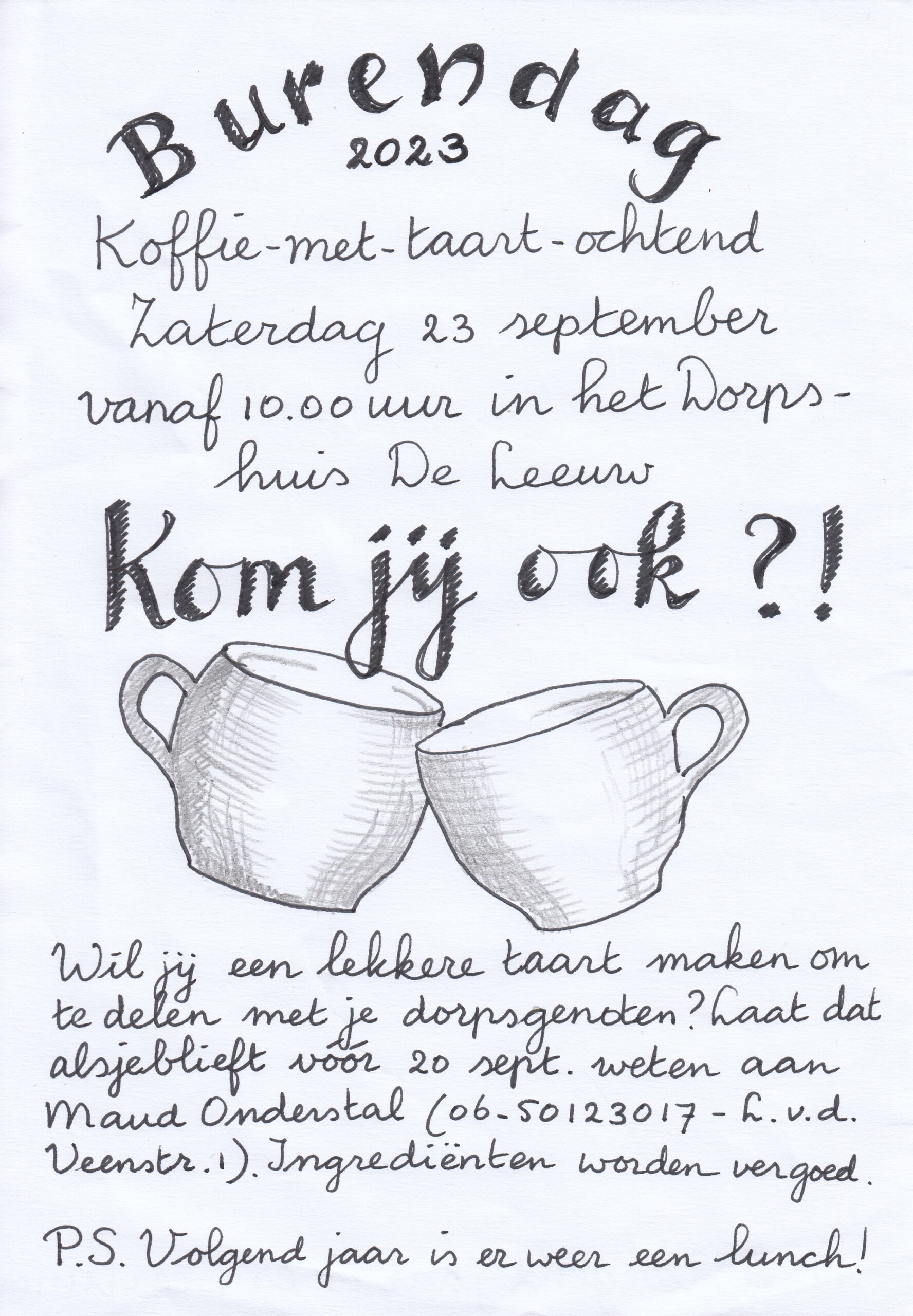 Burendag 2023 wordt dit jaar iets anders aangepakt dan u gewend bent. De Dorpslunch, zoals u die al een paar jaar kent, wordt dit jaar ‘Een Koffie-met-Taart-Ochtend’. Op zaterdag 23 september in dorpshuis De Leeuw, in het café en op het terras, tussen tien en één. Iedereen kan zo binnenlopen. En voor de taart geldt: ‘zolang de voorraad strekt ‘. Dus zorg dat je erbij bent. Onze ‘Koffie-met-Taart-Ochtend’ wordt gesponsord door het Oranjefonds. Het Oranjefonds stelt namelijk subsidie beschikbaar voor het organiseren van een Burendag-activiteit. Goede buren zijn belangrijk, zoals het spreekwoord al zegt. En waar leer je elkaar beter kennen? Juist: in dorpshuis De Leeuw!