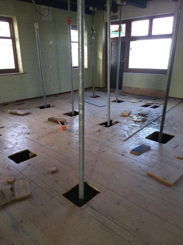 - Daarna werd begonnen met het slopen van de Nehobo-vloeren in de keuken en de gang. Tegelijkertijd werd daar ook het systeemplafond verwijderd. Verrassing: er werd ontdekt dat de muur tussen de gang en grote-zaal de naam muur eigenlijk niet waard is. Het blijkt dat die muur vroeger het begin vormde van het toneel en dus bestond uit twee gemetselde poeren met een ijzeren balk er tussen. Eind jaren zeventig was de ruimte onder de balk dichtgemetseld. Het geheel was zo gammel, vond de sloper, dat hij vreesde dat die muur zou instorten als hij door zou gaan met het slopen van de vloeren in de keuken en gang. Want als die muur zou instorten zou de kans zeer groot zijn dat het dak van het voorhuis zou volgen. Eerst moest de kap dus gestut worden. En dan niet vanaf de zolder natuurlijk, maar vanaf de vaste grond onder de vloer van de zij-zaal. Zie foto’s . Bij het stempelen van de zolderbalklaag in de zij-zaal bleek één van de zolderbalken een ‘holle-doos’ te zijn, een nep-balk dus. Toen tenslotte de kap eenmaal gestut en verstevigd was konden de sneldekpannen verwijderd worden, waardoor de kap ruwweg de helft lichter werd. Pas daarna kon er verder gegaan worden met het slopen van de vloer in de keuken en gang. Eén en ander betekende wel dat aannemer Havenga zijn werkvolgorde drastisch moest wijzigen. Inmiddels zijn de vloeren er uit en de dakpannen er af.
